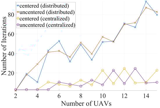 Algorithm 3 requires passing the token along the ring network four times per iteration. These four rounds of communication correspond to the loops on lines 6, 9, 12, and 16 of the algorithm, and each UAV communicates with its neighbors in every round. Therefore, one iteration of Algorithm 3 in the grid is 12,152 ms or 12 s long. Algorithm 3 converges after 30 iterations when there are 2 clusters of targets on the ground, according to Table 3. This is 360 s or 6 min. The same calculation can be completed for a higher number of UAVs. For example, for the case of 100 UAVs (i.e., grid), Algorithm 3 converges after 120 iterations when there are 3 clusters of targets on the ground, according to Figure 9a. Completing this number of iterations on a ring of 100 UAVs takes s or 50 min, which is not practical. The Zigbee network would have to be replaced with a wireless network with higher data rates, such as WiFi, at the cost of higher power consumption.