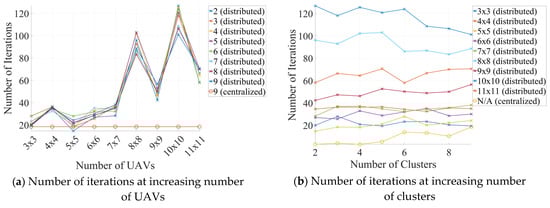 Figure 9b shows the same data points as Figure 9a but rearranged. In this case, the number of iterations is shown as the grid size increases from 3 × 3 to 11 × 11 at numbers of clusters that increase from 2 to 9. The general trend is for the number of iterations to increase with the grid size. This is expected because completing DAC requires more iterations when the data being averaged is distributed across a higher number of UAVs. Figure 9b also shows exceptions to the general trend when the grid size increases from even to odd sizes (e.g., from 4 × 4 to 5 × 5). In other words, the number of iterations increases in both cases, even and odd, but grids of odd size converge faster. For example, the number of iterations is higher for a 10 × 10 grid than an 8 × 8 grid, and it is higher for an 11 × 11 grid than a 9 × 9 grid, but the 9 × 9 and 11 × 11 grids require fewer iterations than the 8 × 8 and 10 × 10 grids. We attribute this behavior to the effect that different network topologies have on DAC convergence [50].