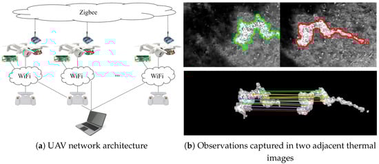 The thermal images in Figure 10b capture the same hotspot on the ground. The hotspot is partially covered on the left image and fully covered on the right image. In practice, adjacent images overlap due to geolocation errors and external factors such as wind. Hotspots are characterized by keypoints that are matched to each other to align the overlapping images. This operation is known as point-set registration [39]. All keypoints belong to the set of observations defined in Section 3, and their coordinates in meters with respect to a user-defined origin can be calculated from the UAVs’ telemetry (i.e., latitude, longitude, altitude, pitch, yaw, and roll) and the thermal camera’s fields of view and resolution.