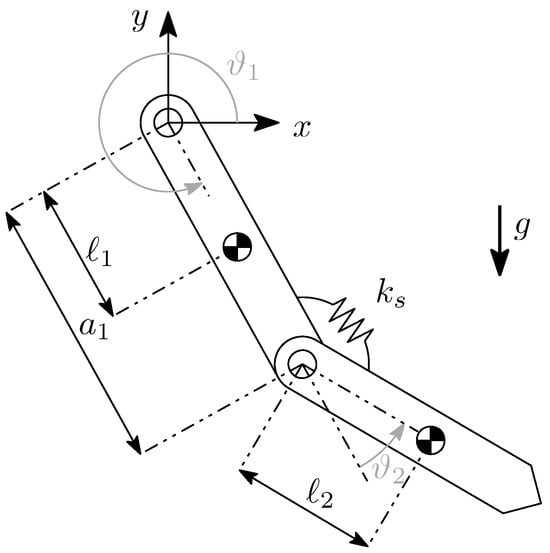 The system under investigation is a planar two-link manipulator with revolute joints. A sketch of the studied manipulator is presented in Figure 1. The first joint is actuated by a motor, while the second joint is passive and equipped with a torsional spring that generates a restoring torque. The second revolute joint is also equipped with a rotary encoder that is, however, not used for the experiment. The system is underactuated, since it has two degrees of freedom and just one actuator.