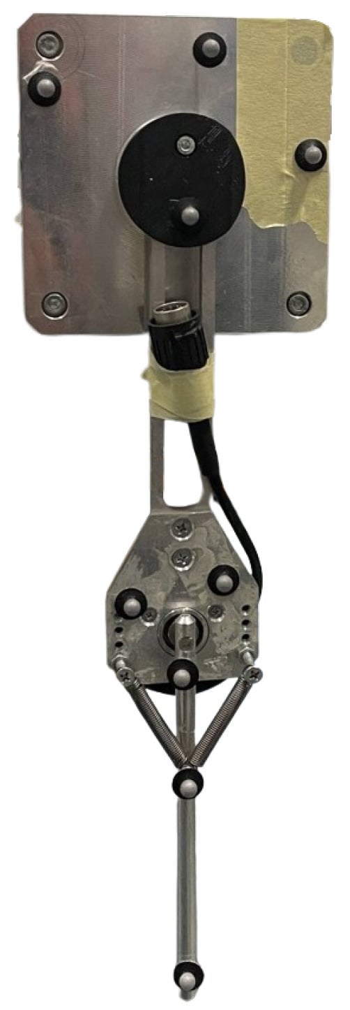 The experimental setup is composed by a two-link planar manipulator actuated only on the first joint by a “Speeder motion line—MB057DG218” motor. The second is passive and a torsional spring is made from two linear springs in parallel. The experimental setup is shown in Figure 2.