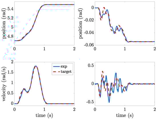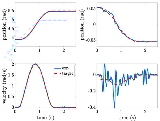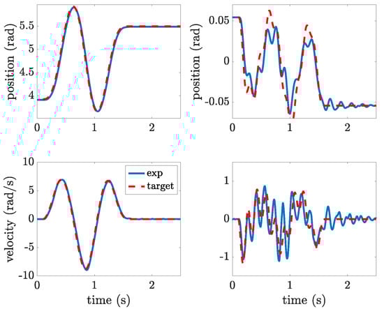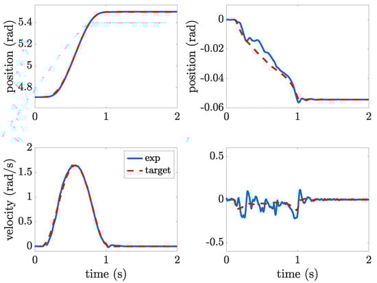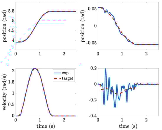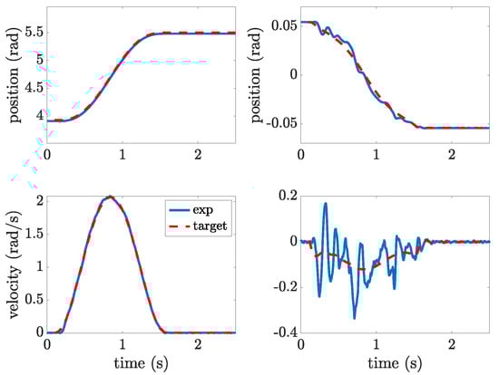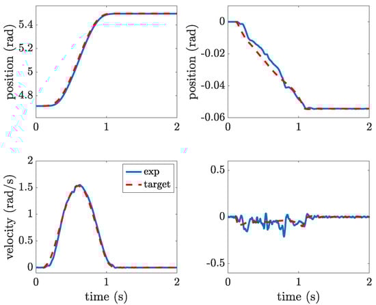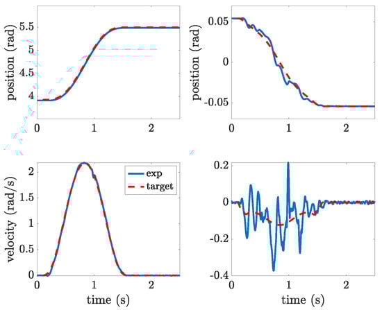 The first test case involves the execution of a rest-to-rest motion from the stable equilibrium position, i.e., from rad to rad. The performance of the energy-optimal motion profile designed according to the method outlined in Section 3 is assessed by a comparison with some shaped polynomial motion profile of degree 5. A fifth-order polynomial profile is chosen as it allows to simply enforce position, speed, and acceleration at the two boundaries. It must be pointed out that the execution of this motion by the first link of the robot would inevitably generate pronounced residual oscillations; therefore, the basic poly5 motion is filtered using input shaping. Input shaping consists of the alteration of a reference profile by convolving it with a sequence of a finite number of impulses with defined timing and amplitude, with the aim of achieving null residual oscillations. Input shapers are widely adopted for their simple implementation and their simple design, which requires just to measure the frequency and the damping factor of the oscillation mode to be suppressed [31,32].