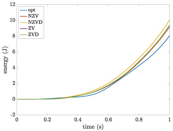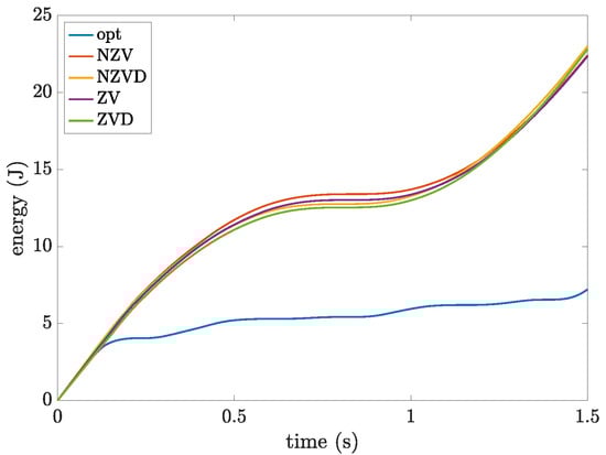 From the energy point-of-view, it is worth noticing that the proposed trajectory allows a very significant saving, as all the others trajectories require at least 3 times more energy, as shown in terms of the evolution of the cumulative energy absorbed by the motor in Figure 14 and as summarized in Table 4.
