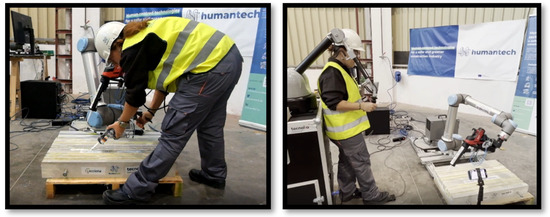 16], a collaborative industrial robot manufactured by Universal Robots, which can handle payloads up to 10 kg and has a reach of 1300 mm. This robot has two characteristics that make it suitable for the job: firstly, it is equipped with advanced safety mechanisms, allowing it to work safely in close proximity to humans without the need for protective barriers. Additionally, it can be integrated with haptic devices for teleoperation, providing operators with force feedback to enhance control and precision, while also enabling remote robot operation. For the task of teaching joint filling with mastic via teleoperation, the robot was installed on a profile table at ground level, with its arm fitted with a mastic gun and controlled using a haptic device.