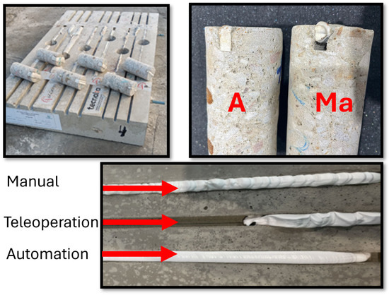 Figure 3 shows the results of the small joint filled in the 3 modalities by an operator. The manual filling of the expansion joint shows irregularities and is not homogeneous. The teleoperated demonstration is not regular either, but the learning from demonstration approach is capable of adequately extracting the robot control parameters to have regular, homogeneous, and smooth filling up to the top joint. To compare the manual (Ma in red) and automatic (A in red) mastic deposition, a portion of the concrete block in each operation mode was extracted after the mastic dried to analyze the performance and check the bottom of the expansion joint (upper-right image). Although from the upper view the joint seems to be correctly filled in manually (Ma), the reality is that the mastic does not fill the totality of the lower part of the joint.