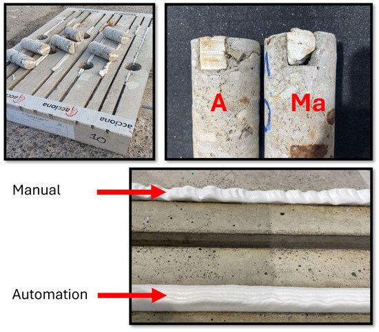 Figure 4 shows a case of an overfilled joint in automation. As can be observed in the lower part of the image, the joint is overfilled both in the manual and automated filling. After mastic excess removal (upper-right image), it can be observed how both joints are filled up to the top, but again in the manual mode, the bottom of the joint is not correctly filled, while in automation, the mastic fits the entire joint.