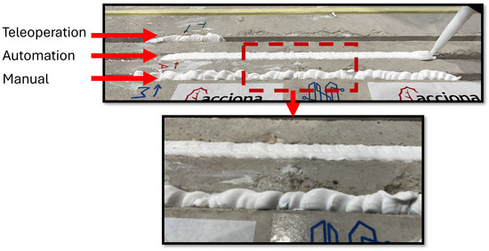 Figure 5 shows the demonstration of a large joint filling performed by an experienced teleoperator, outside the pilot, with the same setup and concrete block. It shows how, with some experience using the teleoperation device, perfect results can be achieved. The zoomed area inside the red bubble provides a closer look at the automation vs. manual joint filling. As can be observed, the manual filling is more uneven compared to the automatic deposition. The automatic filling with the robot ensures the mastic tool contacts the surface [