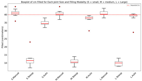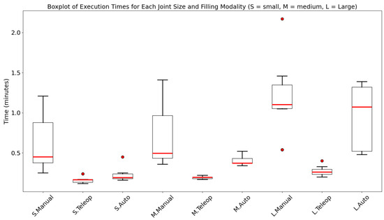 Figure 6 shows a boxplot graph for the three demonstration modalities (manual, teleoperation, and automation) and the three sizes of joints (small, medium, and large), while