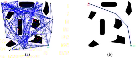 Neural network-based path generation methods have also gradually become a research focus. Hsu et al. proposed a probabilistic roadmap (PRM) method combined with deep neural networks, using neural networks to learn environmental characteristics and generate paths [29]. As shown in Figure 7, the PRM algorithm constructs a roadmap by randomly sampling collision-free points and connecting them to plan a feasible path from start to goal while avoiding obstacles.