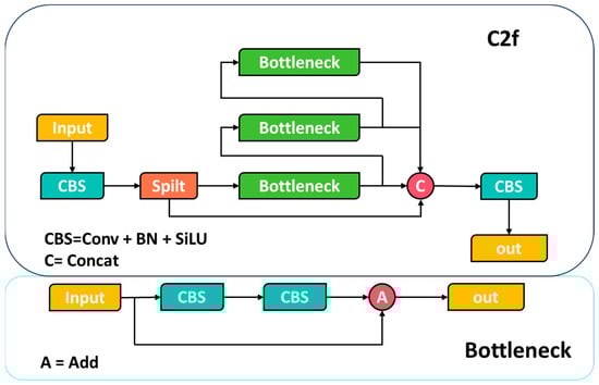 The detailed architecture of the C2f module is illustrated in Figure 10. As shown, the input tensor is split into several partitions, each independently processed by lightweight residual blocks. These outputs are then concatenated and passed through a final convolutional unit (CBS block) to fuse the features, achieving both parameter efficiency and expressive power.