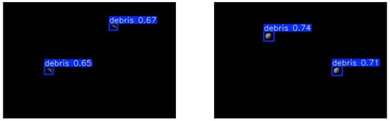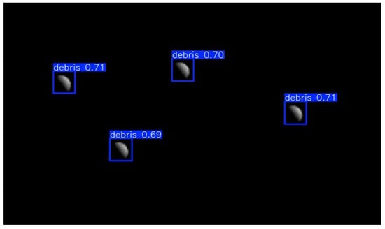 Each image is rigorously annotated, including the bounding box coordinates and exact positions of all visible debris. These annotations are critical for training and evaluating object detection algorithms under challenging orbital conditions. The dataset introduces high variability in terms of illumination, object motion, and background noise, offering a demanding testbed for detection models. Figure 9 illustrates a representative image from the dataset, highlighting the visual difficulty posed by small, irregularly shaped, and low-contrast debris against a dark space environment.