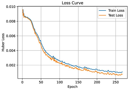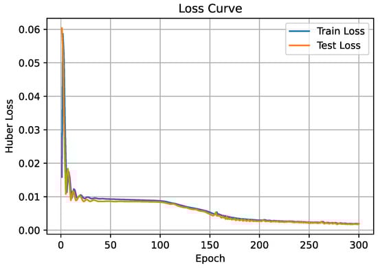 Throughout training, the test loss (orange) nearly overlaps the train loss (blue), with only minor fluctuations, indicating excellent generalization and minimal overfitting. This behavior shows that adding KAN not only accelerates early learning but also drives the model to a significantly lower final error, underscoring its enhanced ability to capture complex nonlinear and temporal patterns.