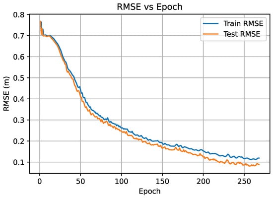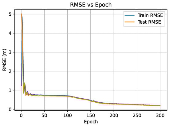 RMSE Comparison: As shown in Figure 33, it plots the RMSE of the Transformer model over 300 training epochs. The RMSE decreases from an initial value of roughly m at epoch 0 to about m by epoch 1, demonstrating a steep initial learning. Over the next 20 epochs, the error falls to approximately m, followed by a smoother decline to m at epoch 100 and m at epoch 150. In the late stage (epochs 150–300), RMSE continues to improve gradually, reaching m at epoch 200, m at epoch 250, and approaching m by epoch 300. The near-coincidence of training and test curves throughout indicates strong generalization and minimal overfitting. These trends suggest that the Transformer quickly captures dominant low-frequency patterns, while the further refinement of higher-frequency components yields diminishing returns over extended training.