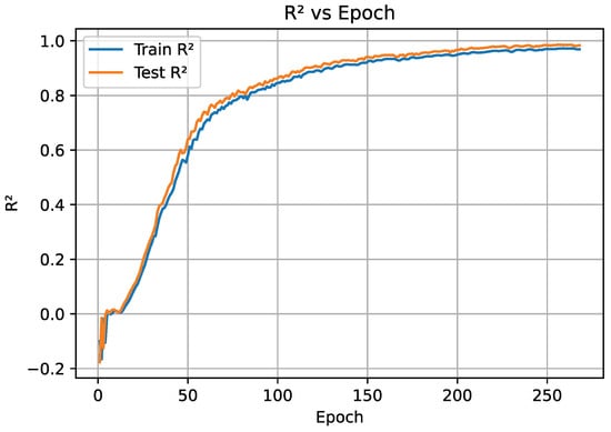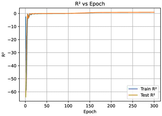 In comparison, the Transformer+KAN model shown in Figure 36 follows a much more desirable trajectory. Although it also starts with erratic fluctuations, begins to rise steadily after epoch 80. By epoch 200, it surpasses 0.9 and ultimately reaches around 0.935. This high final score signifies that the model captures nearly all the variance in the data, showcasing its superior generalization ability.