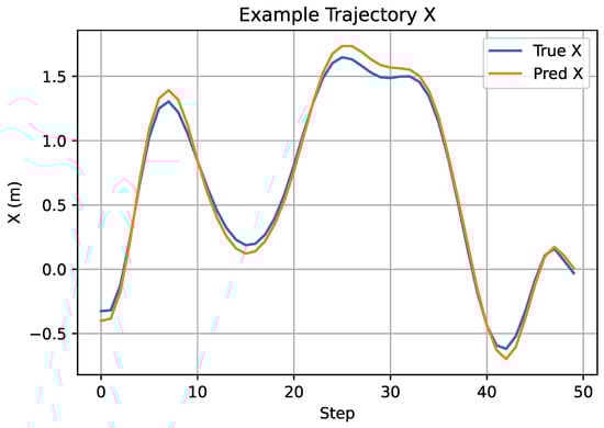 Trajectory prediction on X axis: The effectiveness of the model in capturing real-world temporal dynamics is further demonstrated by the predicted trajectory in the X-axis dimension, as shown in Figure 37. The Transformer+KAN model generates predictions that closely align with the ground truth across the entire time span. It successfully reproduces the amplitude and frequency of oscillations, including sharp peaks and valleys, with high fidelity.