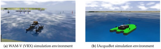 Simulation environments used for this study: (a) WAM-V platform running in the VRX simulation framework; and (b) IAcquaBot platform simulated using Gazebo-based simulation framework.