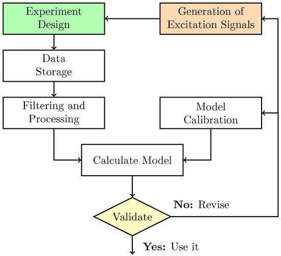 The system identification (see Figure 3) begins with the experiment design, generating excitation signals for each thruster to stimulate the USV and recording its response. These signals include sinusoidal, square, mixed, constant, and random functions. For each time instant k, the rise time () and ultimate time () were calculated. The signals generated for model identification and validation can be found in Appendix A.