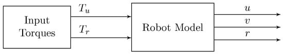 In conventional simulation workflows, control inputs, such as generalized torques (, ), are directly fed into the plant, and the resulting linear and angular velocities (u, v, r) are observed. This process assumes that the physical model accurately represents the real system. The flow can be expressed as shown in Figure 4.