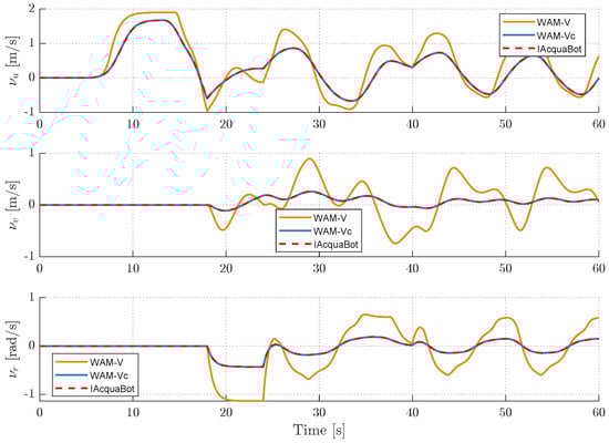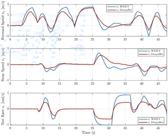 Figure 9 compares the velocity responses for the joystick-generated inputs in three cases: (i) the IAcquaBot response to joystick inputs; (ii) the WAM-V response to the same joystick inputs, computed using its own identified model; and (iii) the WAM-V response obtained via the velocity controller using the IAcquaBot velocities as reference (WAM-Vc).