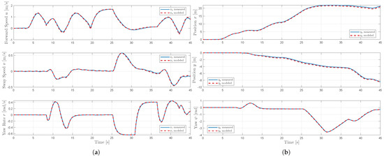 Validation of the identified dynamic model for the WAM-V platform. (a) Velocities in the body-fixed frame: , , and . (b) Positions and orientation in the inertial frame: , , and .