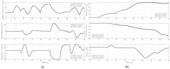 Subsequently, two additional experiments were conducted to validate the identified dynamic models. Figure 7a,b present the comparison between the measured data and the simulated responses of the IAcquaBot model, while Figure 8a,b show the corresponding results for the WAM-V. In both cases, the models were excited using the input signals depicted in Figure A1b. The corresponding tracking error metrics for each state variable are summarized in Table 6. The close agreement between the measured states and the model outputs confirms that the identified parameters provide a sufficiently accurate representation of each USV for control design and simulation purposes.