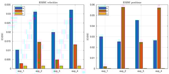 Furthermore, four additional experiments were conducted to assess robustness under exogenous disturbances with different magnitudes and headings, combining steady currents and winds. The disturbance configurations for each trial are summarized in Table 8, and the resulting tracking errors (RMSE) are reported in Figure 10. Across all cases, both velocity and position errors remained in the range.
