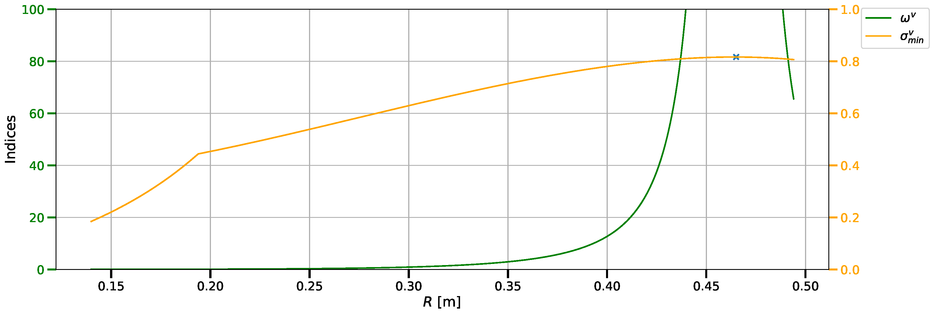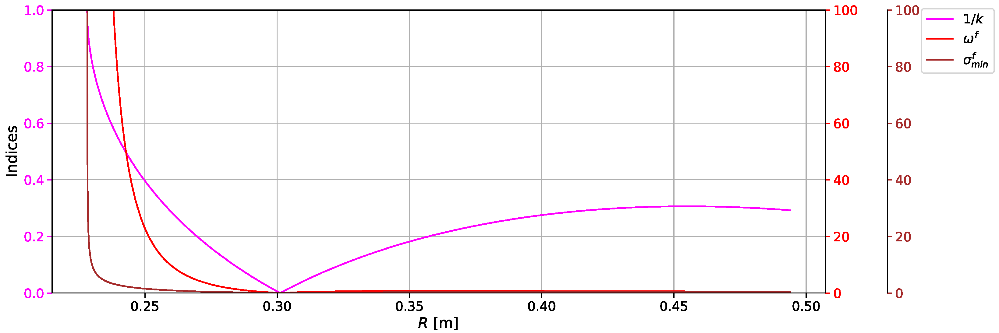 The performance evaluation is conducted using the same grid-based discretization applied for the workspace volume estimation, consisting of points. For every reachable coordinate within this grid, the inverse geometric problem is solved. In the case of the RDR, this involves a systematic search for the optimal reconfiguration parameter R by sampling the range [0.138, 0.495] m with a high-resolution step of 0.001 m. At each configuration, Jacobian-based performance indices—such as velocity manipulability, minimum singular values, and the condition number—are computed and recorded. This methodology allows for a comprehensive mapping of kinematic dexterity across the entire workspace, providing a robust statistical basis for comparing the operational safety and mobility of both robot architecture.