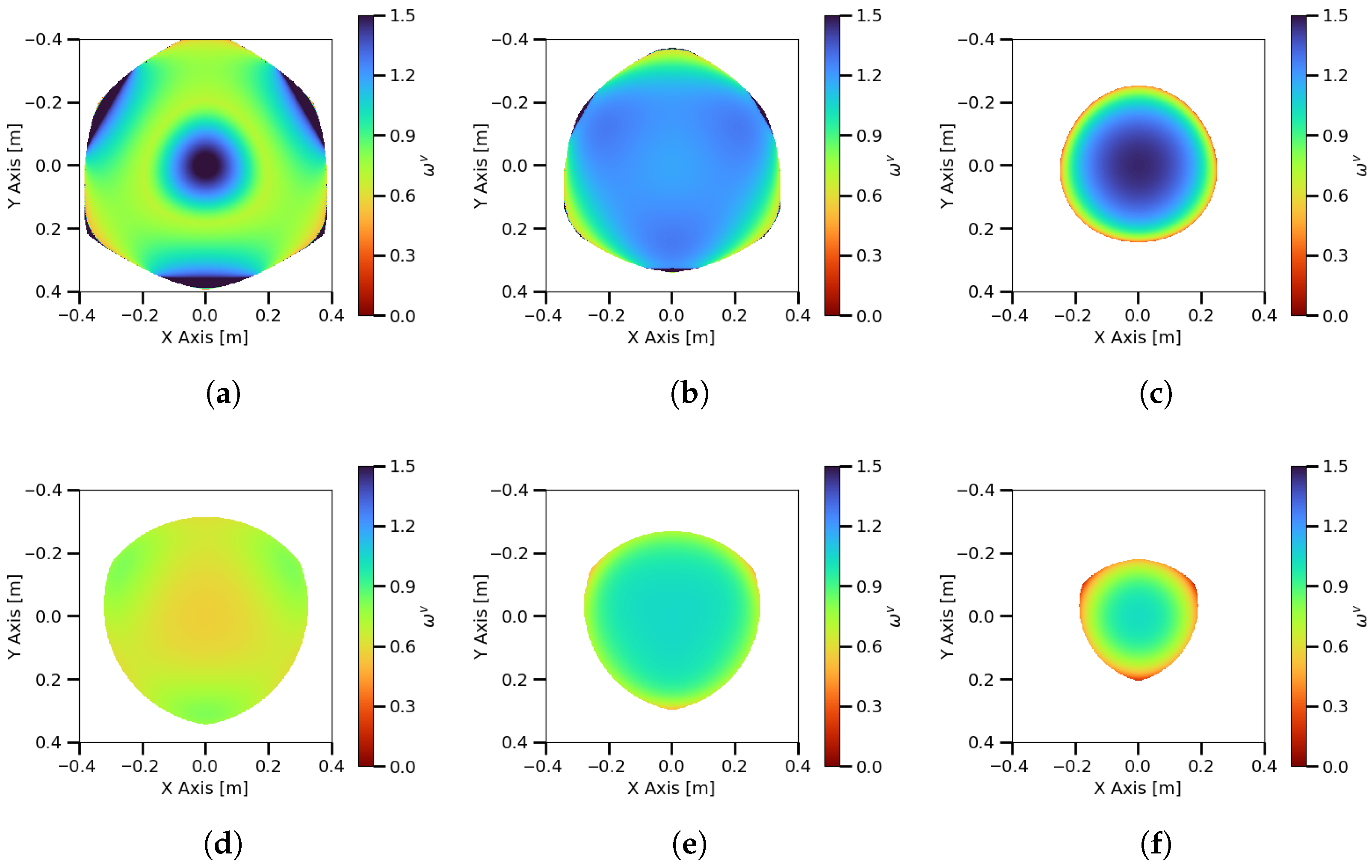 Figure 8d, non-reconfigurable), it is observed that the reconfigurable robot not only covers a larger cross-sectional area but also presents extensive regions with high and more homogeneous values of