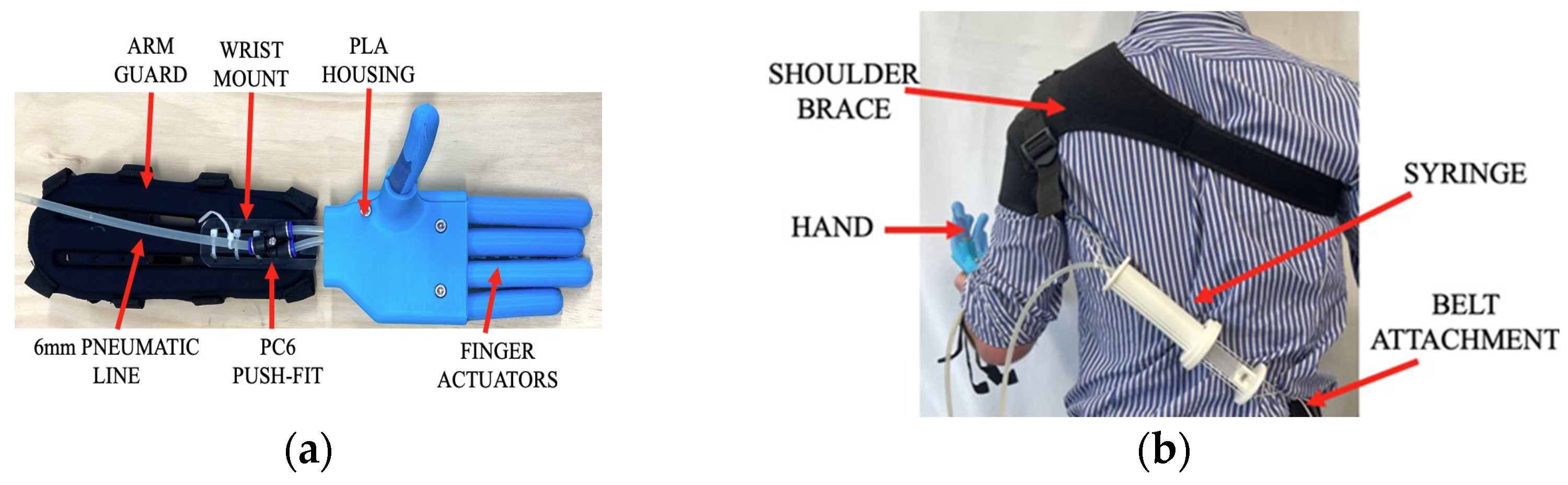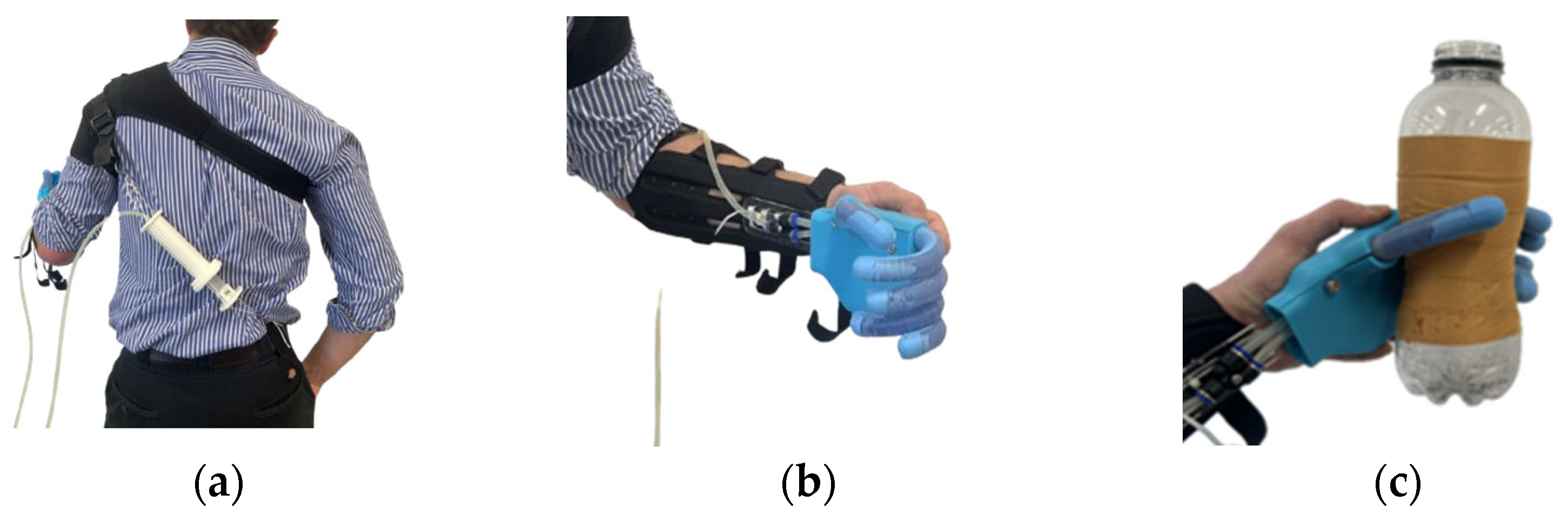 - Motaghedolhagh, K.; Shariati, A.; Homer-Vanniasinkam, S.; Wurdemann, H. Soft Wearable Body-Powered Hydraulic Actuation System for a Prosthetic Finger Design. IEEE Trans. Biomed. Eng. 2024, 71, 3543–3555. [Google Scholar] [CrossRef]