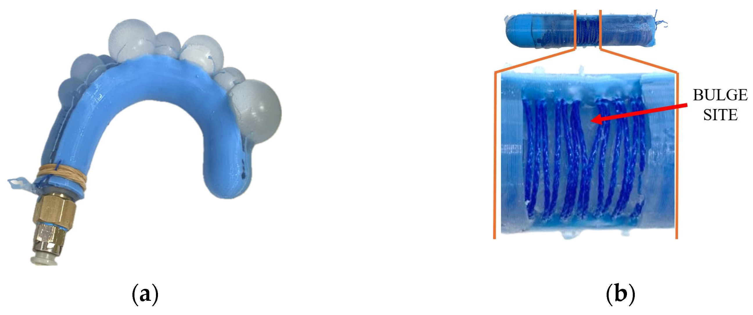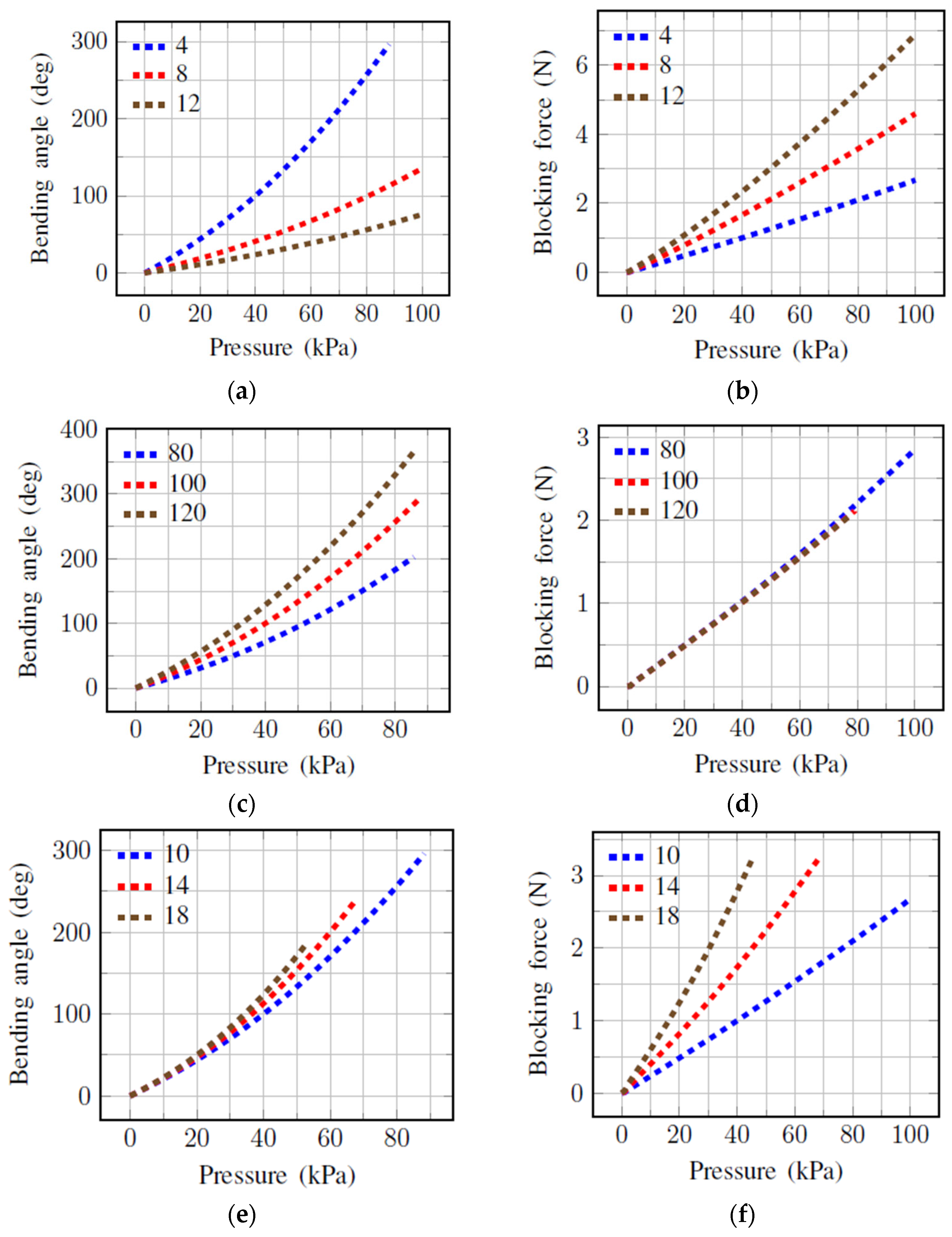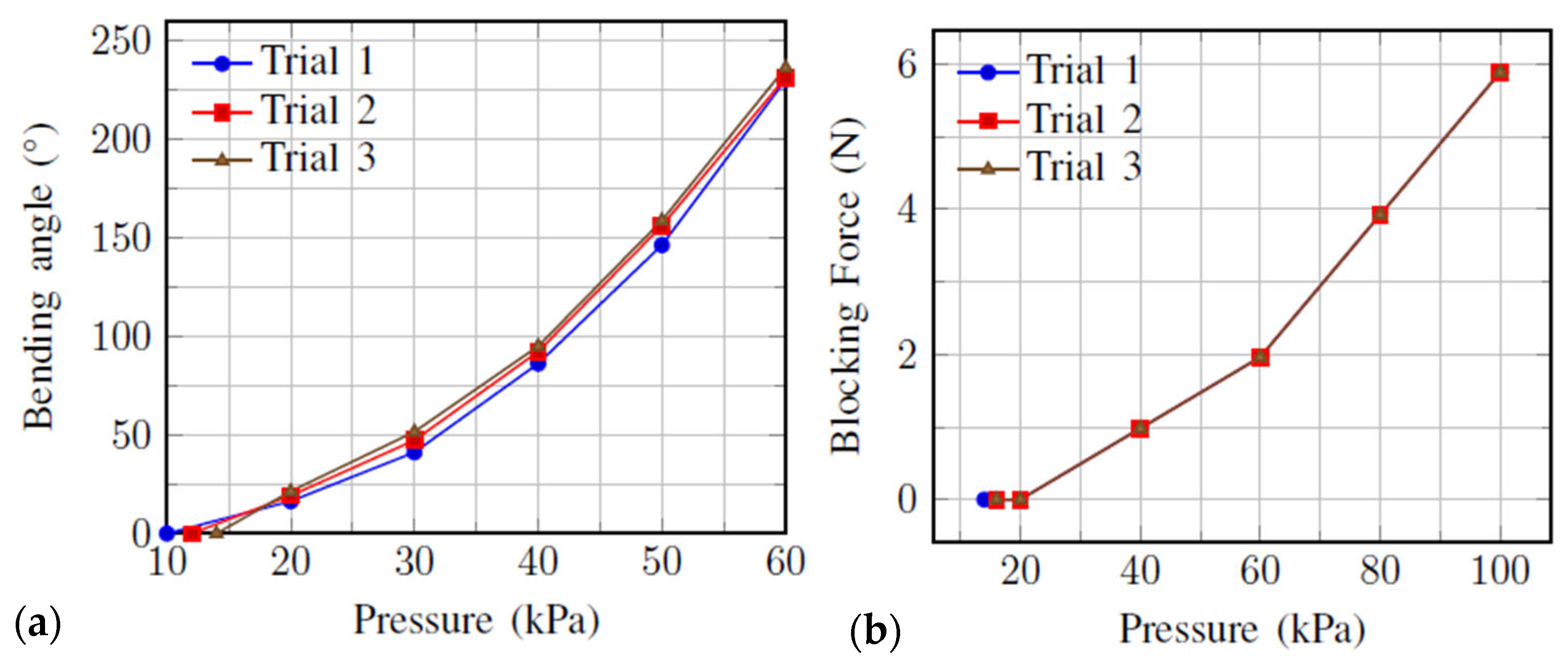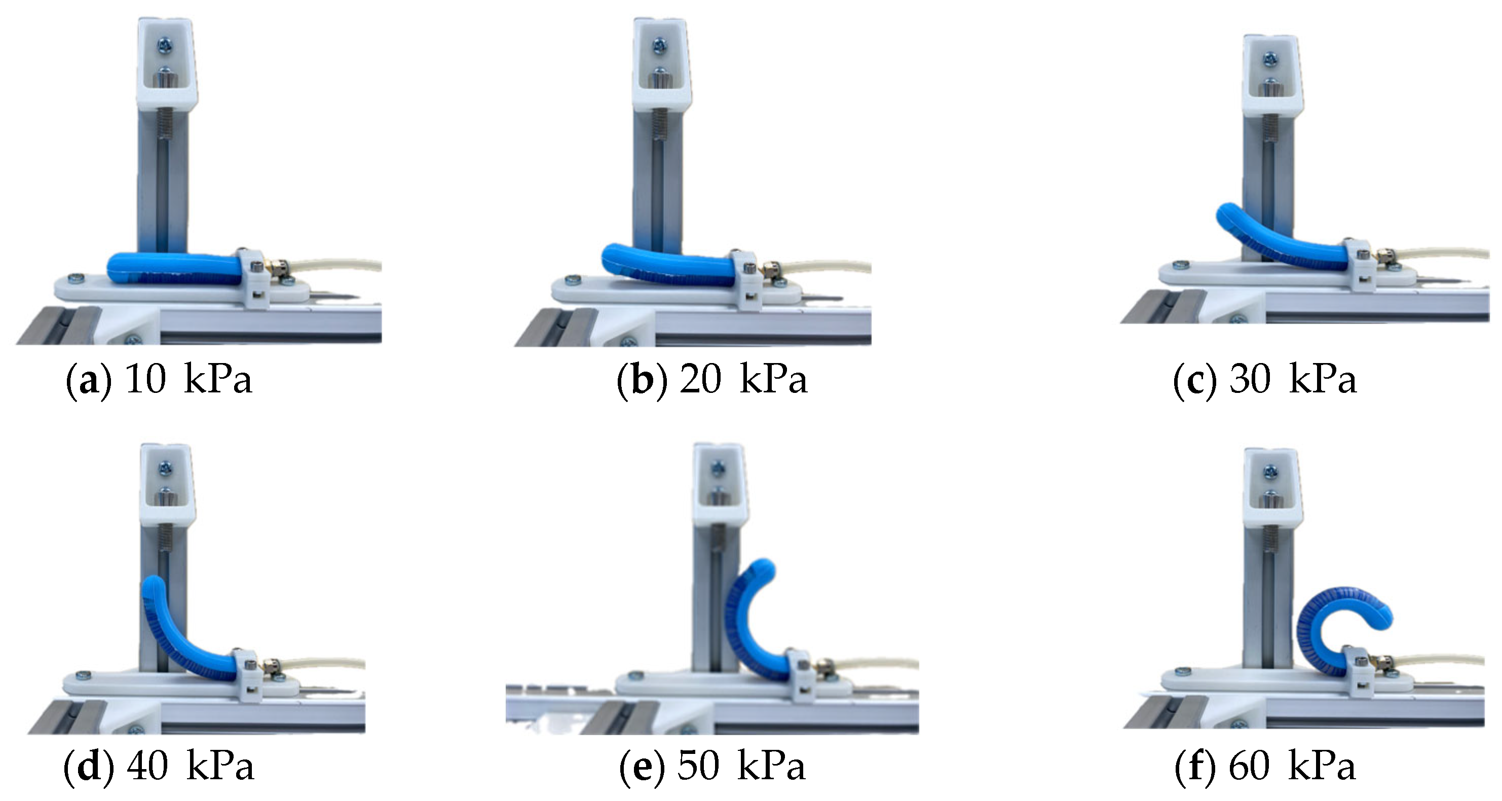 - Wang, B.; Aw, K.C.; Biglari-Abhari, M.; McDaid, A. Design and fabrication of a fiber-reinforced pneumatic bending actuator. In Proceedings of the 2016 IEEE International Conference on Advanced Intelligent Mechatronics (AIM), Banff, AB, Canada, 12–15 July 2016; pp. 83–88. [Google Scholar] [CrossRef]