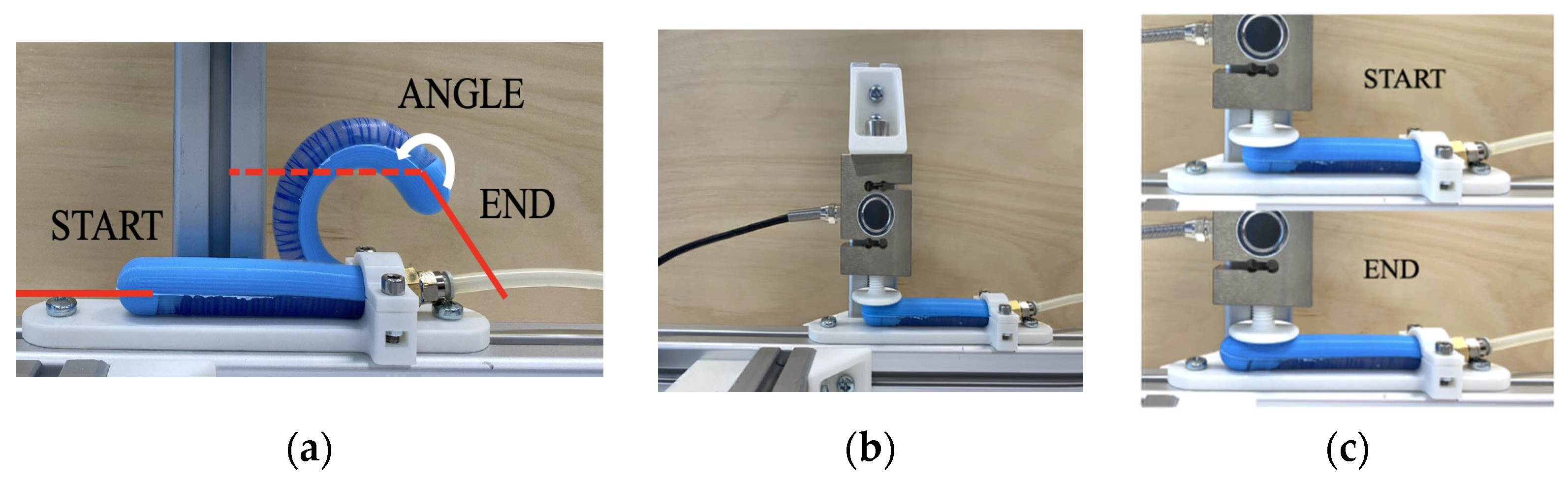 - Wang, Z.; Polygerinos, P.; Overvelde, J.T.B.; Galloway, K.C.; Bertoldi, K.; Walsh, C.J. Interaction Forces of Soft Fiber Reinforced Bending Actuators. IEEE/ASME Trans. Mechatron. 2017, 22, 717–727. [Google Scholar] [CrossRef]