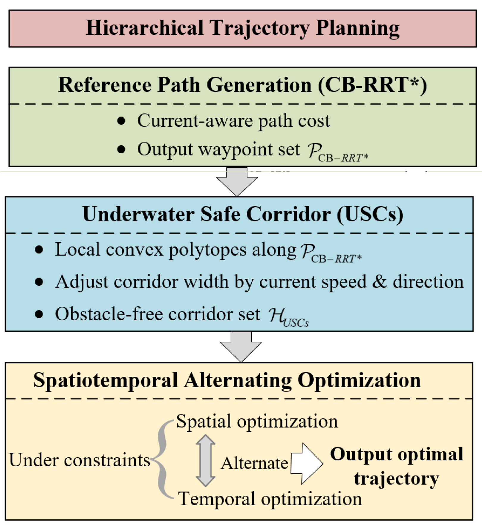 - A current-aware hierarchical trajectory planning framework is proposed that decouples path generation from trajectory optimization, enhancing scalability and computational efficiency in complex 3D marine environments.