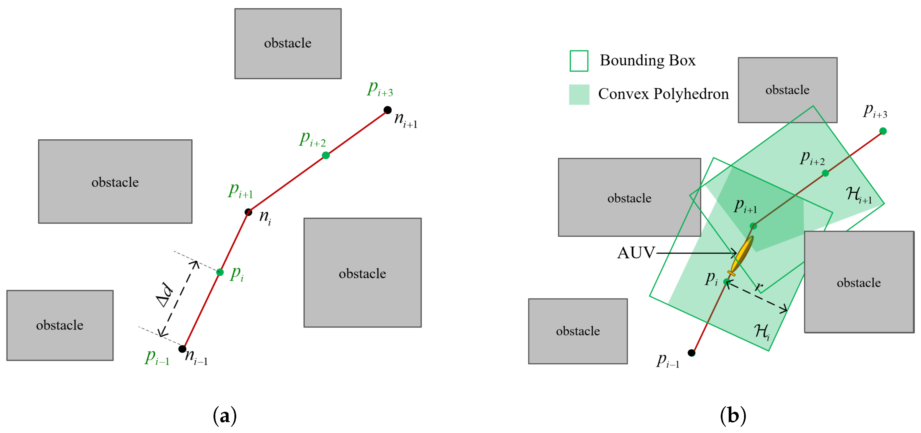 - Liang, Q.; Zhao, X.; Ye, X. A Motion Planning Method for an Autonomous Underwater Vehicle with Kinematic Constraints. In Proceedings of the IEEE International Conference on Mechatronics and Automation (ICMA), Harbin, China, 6–9 August 2023; IEEE: Piscataway, NJ, USA, 2023; pp. 923–928. [Google Scholar] [CrossRef]
