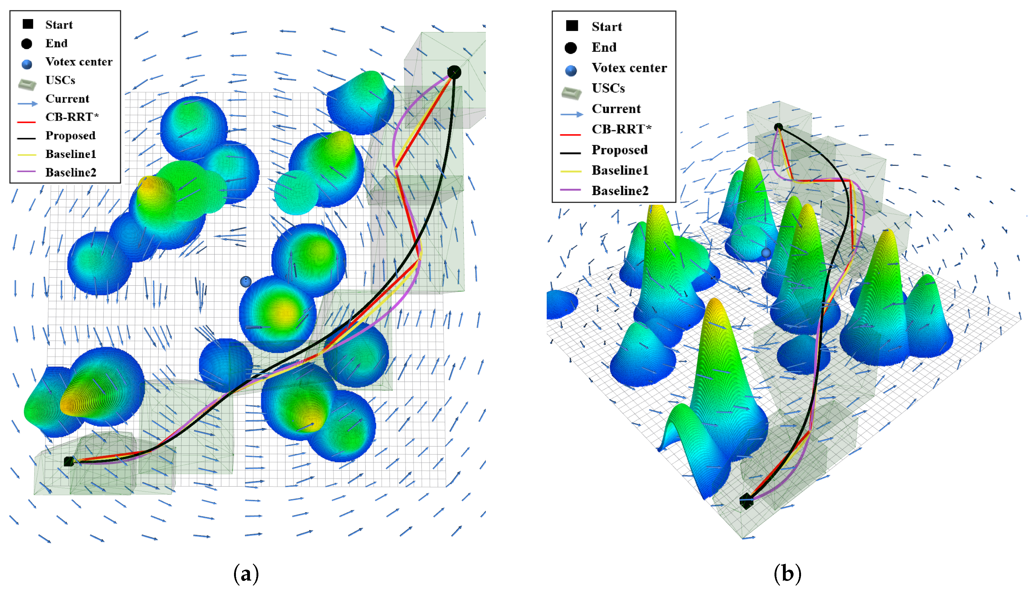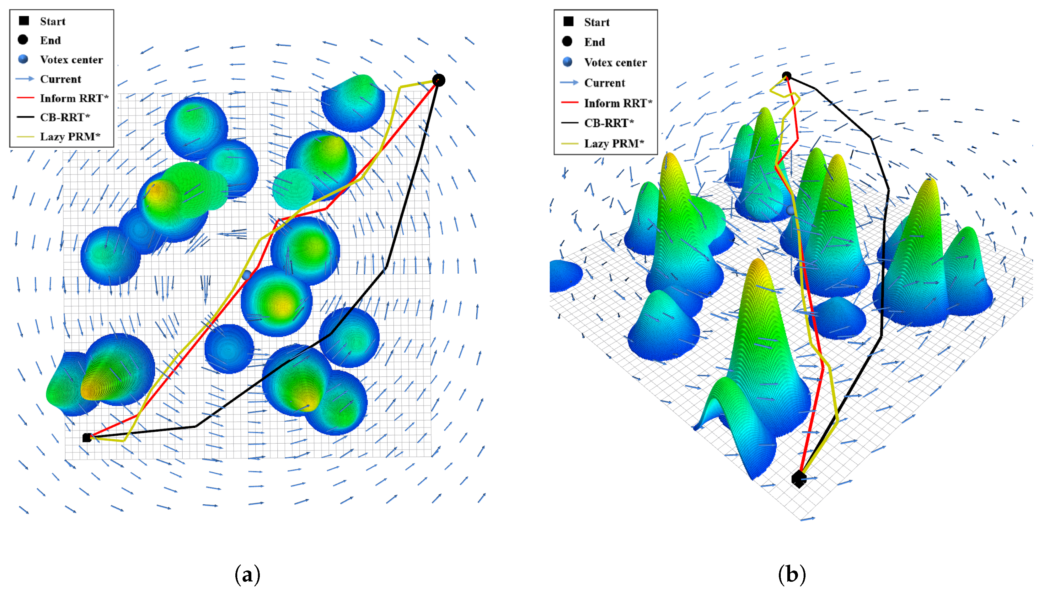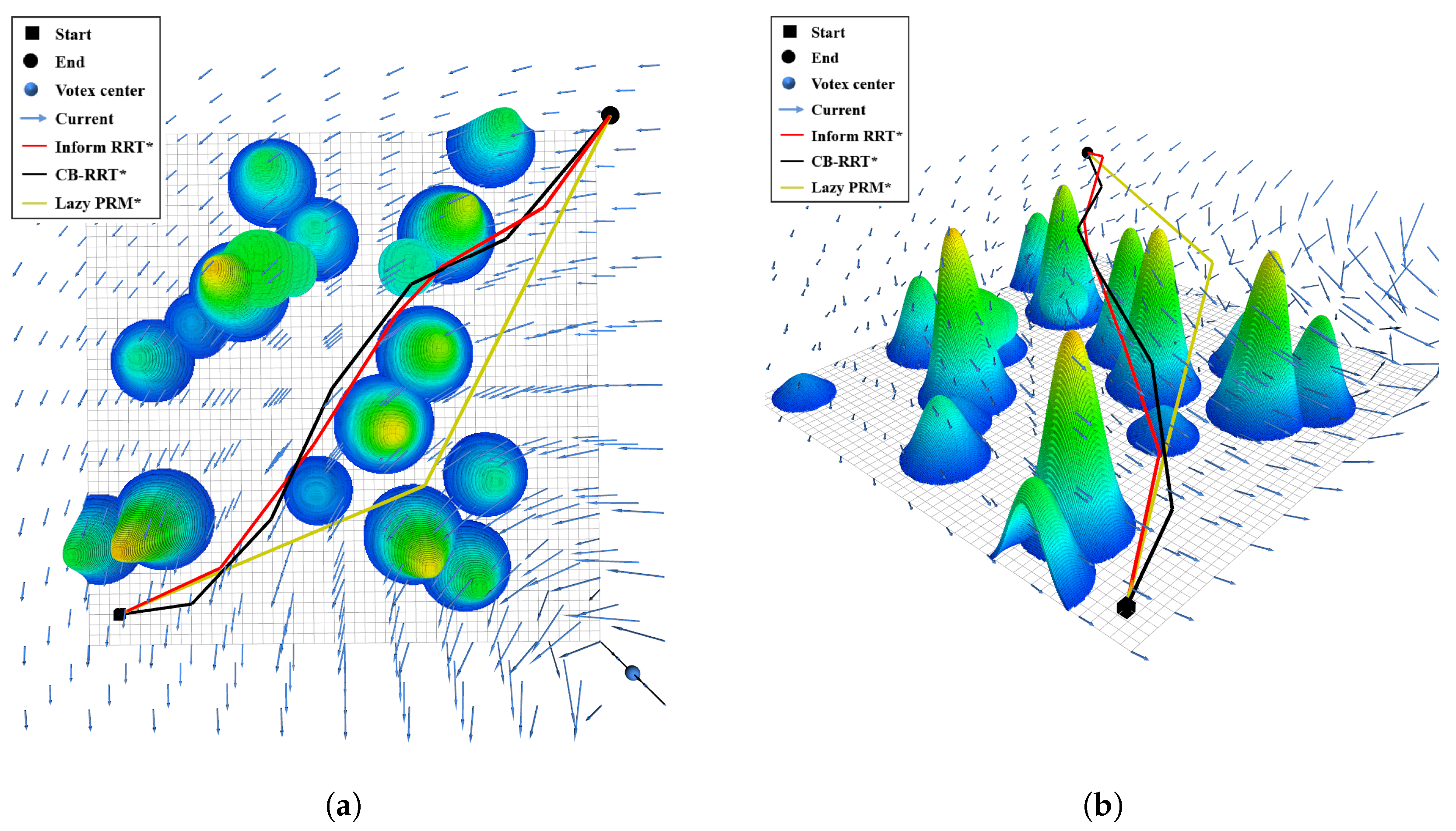 - Flow-Field Adaptability: CB-RRT* demonstrates an explicit tendency to exploit favorable current regions, selecting segments where local flow vectors provide propulsion assistance or reduced resistance. The baseline algorithms, however, largely prioritize geometric distance and therefore ignore the hydrodynamic implications of the surrounding flow field.