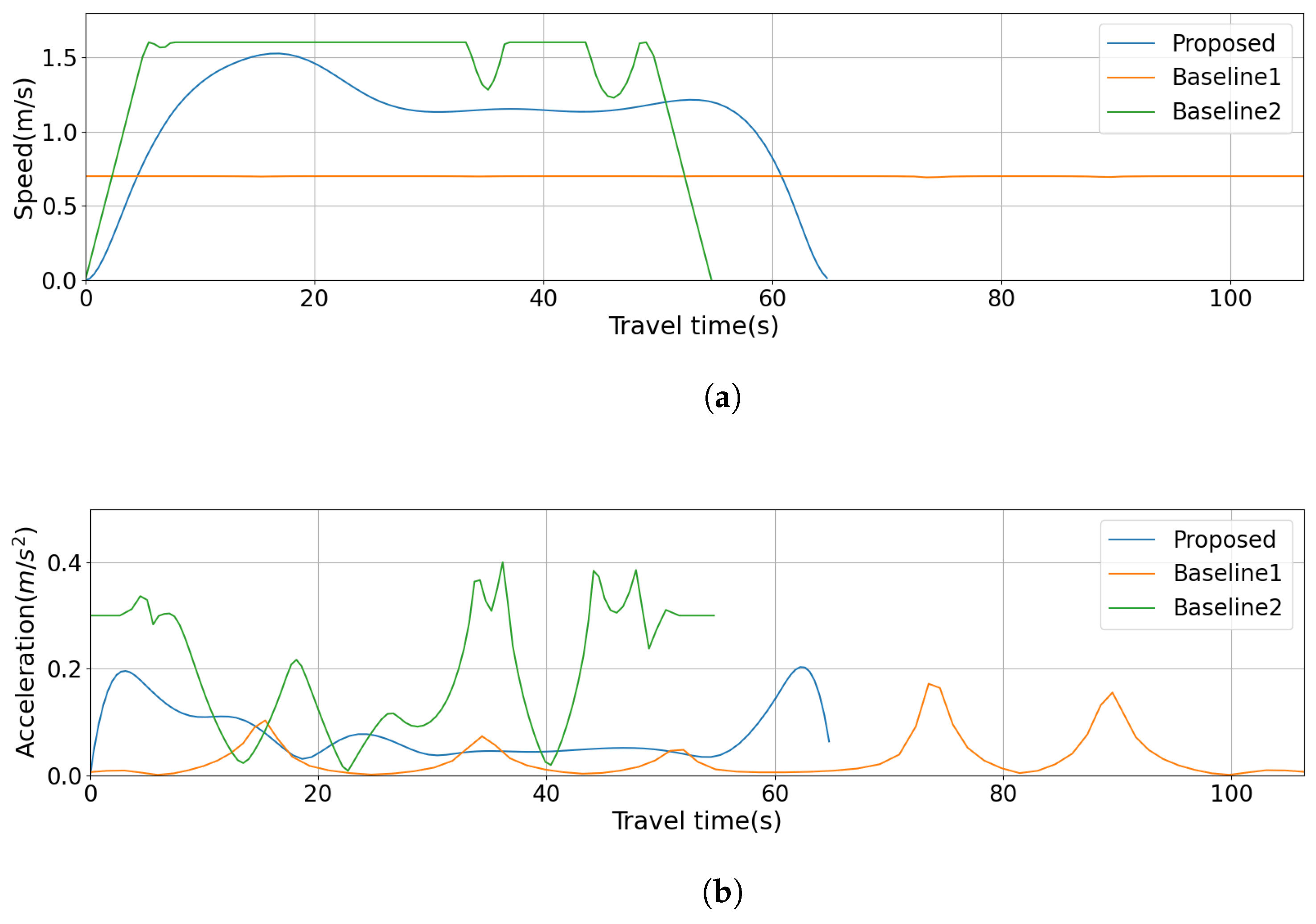 - Baseline 2 (Decoupled Optimization + TOPPRA): The geometric profile is first refined using B-Spline smoothing, and the temporal parameterization is subsequently obtained via the Time-Optimal Path Parameterization (TOPPRA) algorithm [24]. To ensure comparability with the proposed framework, the velocity and acceleration bounds imposed in TOPPRA are kept identical to those adopted in our method, thereby isolating the effect of the optimization paradigm itself.