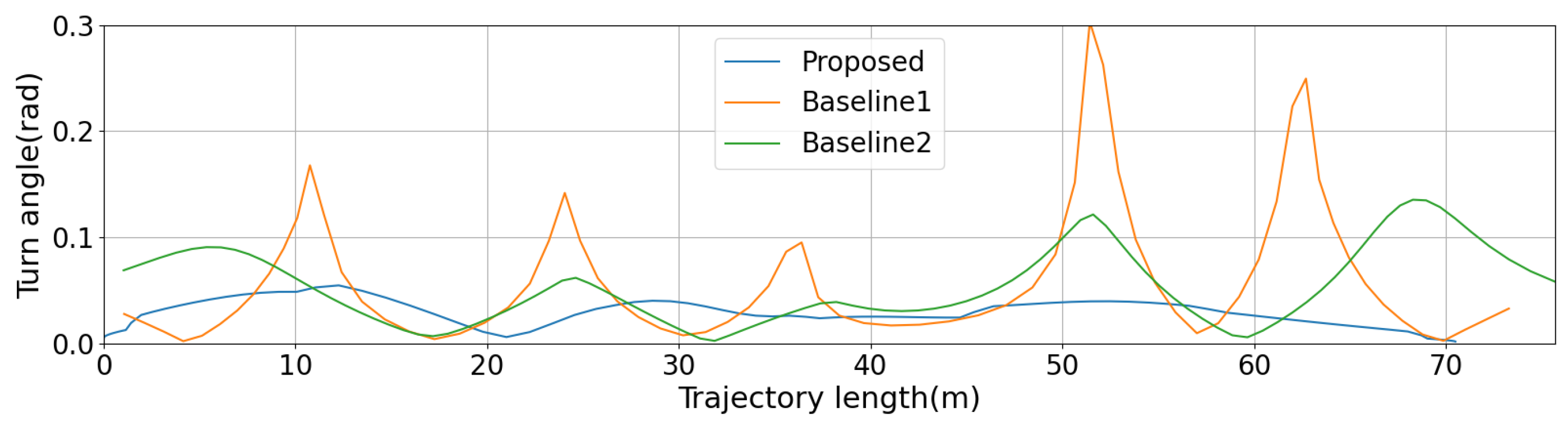 | Scenario | Method | Length (m) | Max Turning Angle (rad) | Total Turn (rad) | Energy | Time (s) | Cost |