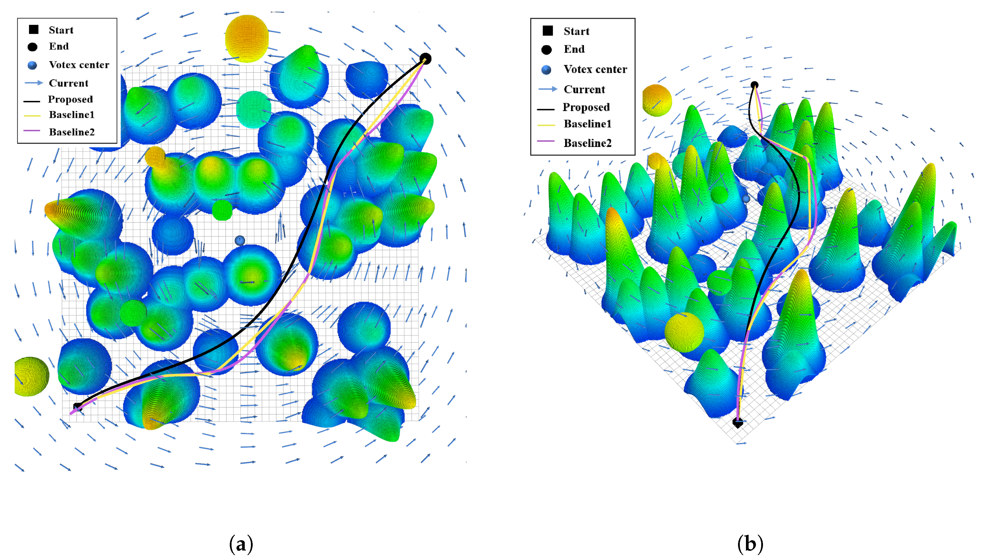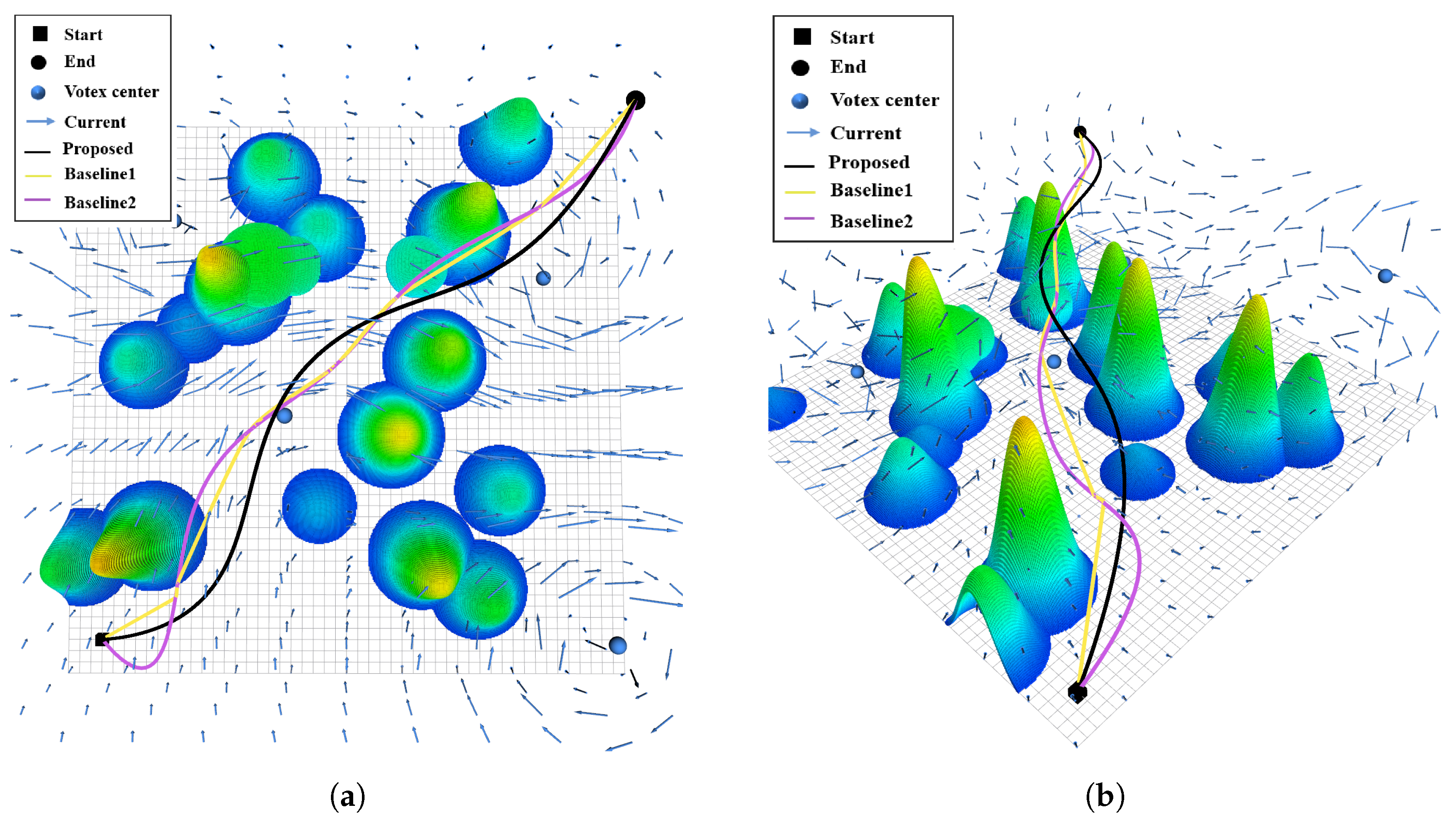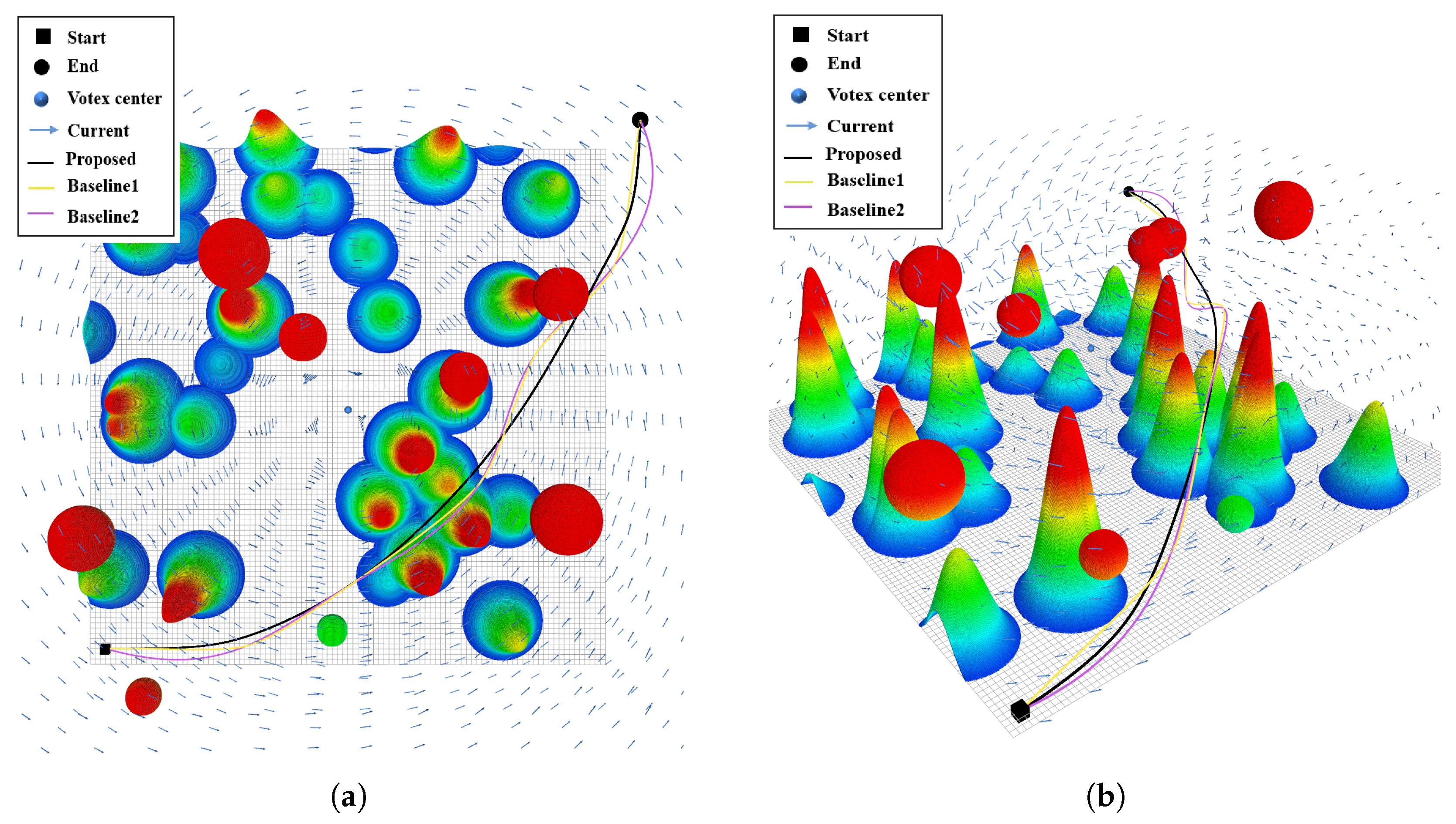 - Upstream Scenario: The goal lies upstream, forcing the vehicle to overcome current resistance or exploit low-velocity corridors to reduce energy loss.