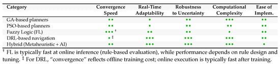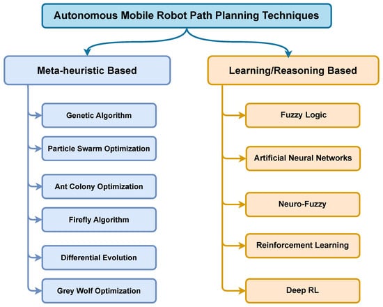 Over the past two decades, metaheuristic and artificial intelligence (AI)-based approaches have emerged as powerful alternatives to classical and heuristic methods for AMR path planning. Metaheuristic algorithms, such as Particle Swarm Optimization (PSO), Genetic Algorithms (GA), Ant Colony Optimization (ACO), Firefly Algorithm (FA), and Grey Wolf Optimization (GWO), provide versatile optimization frameworks capable of exploring large and complex search spaces [2,3]. These methods are often robust to problem nonlinearity, adaptable to multiple objective criteria, and applicable in both static and dynamic environments. In parallel, reasoning- and learning-based techniques, including Fuzzy Logic (FL), Artificial Neural Networks (ANN), Neuro-Fuzzy (NF) systems, Reinforcement Learning (RL), and Deep Reinforcement Learning (DRL), leverage computational intelligence to enable adaptive decision-making, perception-driven navigation, and autonomous policy learning in challenging scenarios.