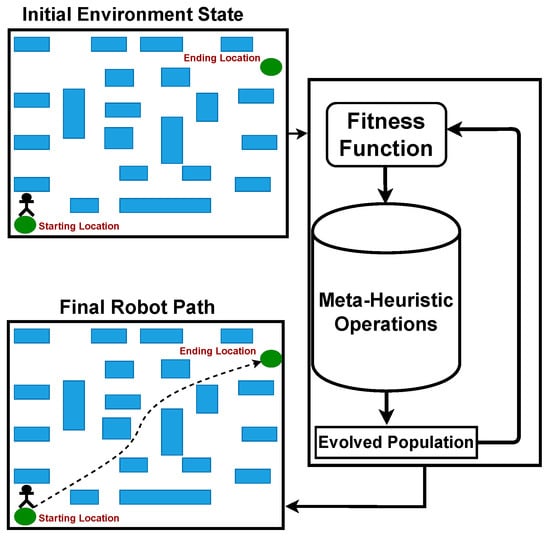 Metaheuristics are high-level optimization strategies designed to explore and exploit the solution space more effectively than problem-specific heuristics, particularly for complex, nonlinear, and multi-objective problems [14]. In the context of AMR path planning, metaheuristic algorithms operate iteratively, starting with an initial set of candidate solutions and refining them through evolutionary or swarm-based processes. At each iteration, a fitness function evaluates the quality of candidate paths, guiding the search toward near-optimal or optimal solutions (Figure 4). Their generality and flexibility make them applicable across diverse AMR navigation scenarios, from static grid-based maps to dynamic, cluttered environments [15,16].