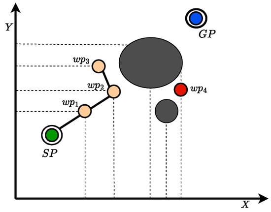 PSO has been applied to AMR path planning in static and dynamic settings, often serving as a global planner for generating short routes [27] and handling constrained navigation in harsh static terrain through diversity-enhancing update mechanisms, such as crowding-radius strategies, outperforming baselines like NSGA-II [28]. In environments with static convex obstacles, PSO-based planning can construct candidate waypoint sequences and evaluate them using fitness terms that trade off distance, clearance, and smoothness [29]; Figure 7 illustrates the PSO waypoint-based planning principle in a static map: feasible waypoint sequences guide the swarm from start to goal, while infeasible waypoints (e.g., ) are penalized. For dynamic scenarios, PSO has also been combined with sensing and scheduling mechanisms, such as IR-based detection and time allocation, to reduce robot–robot and robot–obstacle collisions [30].