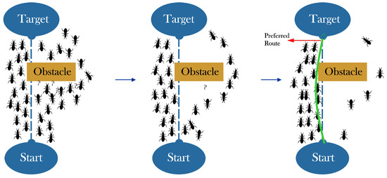 Ant Colony Optimization (ACO) is a bio-inspired technique that models the pheromone-based foraging behavior of ants to solve complex optimization problems, initially introduced by Dorigo in the late 1990s [68]. It is based on the foraging behavior of ants, which use pheromone trails to communicate paths between their colony and food sources [69]. Ants collectively explore, avoid hazards, and reinforce viable routes by depositing pheromones. The intensity of pheromones guides subsequent search behavior. Figure 9 provides an intuitive illustration of ACO’s foraging-inspired mechanism: candidate paths emerge through repeated agent exploration, while pheromone reinforcement biases subsequent ants toward shorter and safer routes around obstacles. The synergy of population-based global search and positive feedback makes ACO suitable for path discovery, even with incomplete environmental information [70]. ACO has been widely applied in AMR path planning for selecting efficient, collision-free paths in both static and dynamic environments [71]. This survey focuses on recent works, whereas previous surveys covered a broader range of earlier studies.