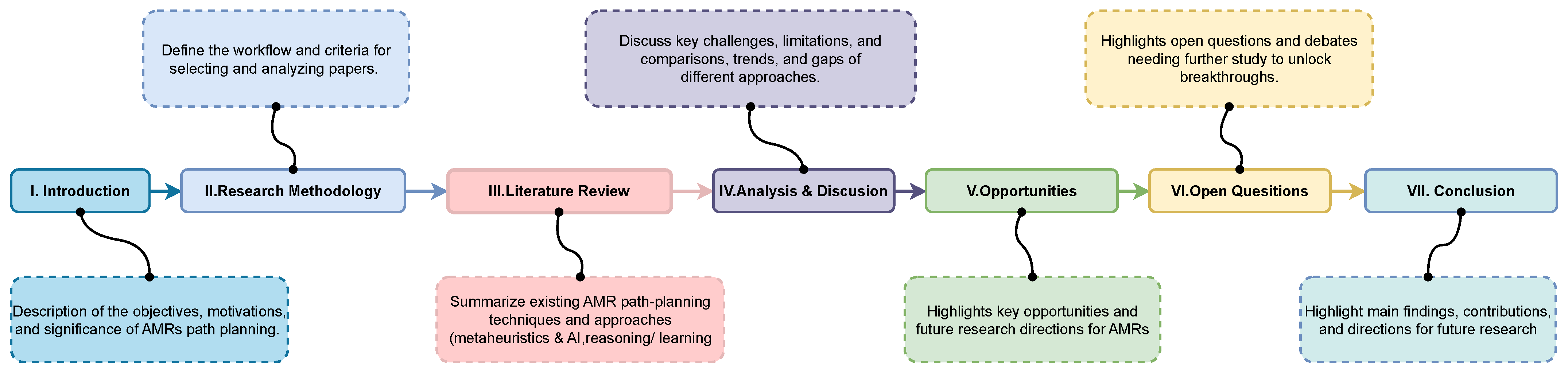 - Introduce a dedicated discussion of open research questions in AMR path planning, providing a roadmap for addressing safety guarantees, explainability, benchmarking, and lifelong adaptation in complex real-world environments.