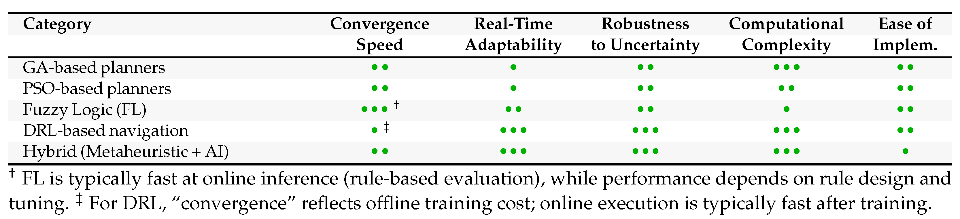| FL | Robust to sensor noise and uncertainty; interpretable decision-making using linguistic rules | Rule design is heuristic and problem-specific; scalability and performance degrade with complex scenarios |