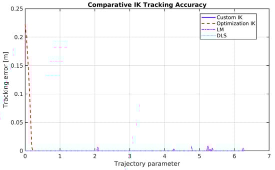 Comparative IK tracking accuracy over the trajectory (custom, fmincon, LM, DLS).