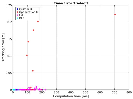 The time-=error tradeoff plot in Figure 6 provides a clear summary of the performance comparison. The custom IK occupies the ideal region of the plot, consistently delivering high accuracy (low error) at very low computational cost. The optimization-based solver’s results are scattered, showing both higher computation times and wide variance in the tracking error. For LM, the points are concentrated near low error, but include several high-error and high-time outliers. DLS clusters at low time and modest error, but only yields one branch. Overall, the custom method remains the best choice for this application.