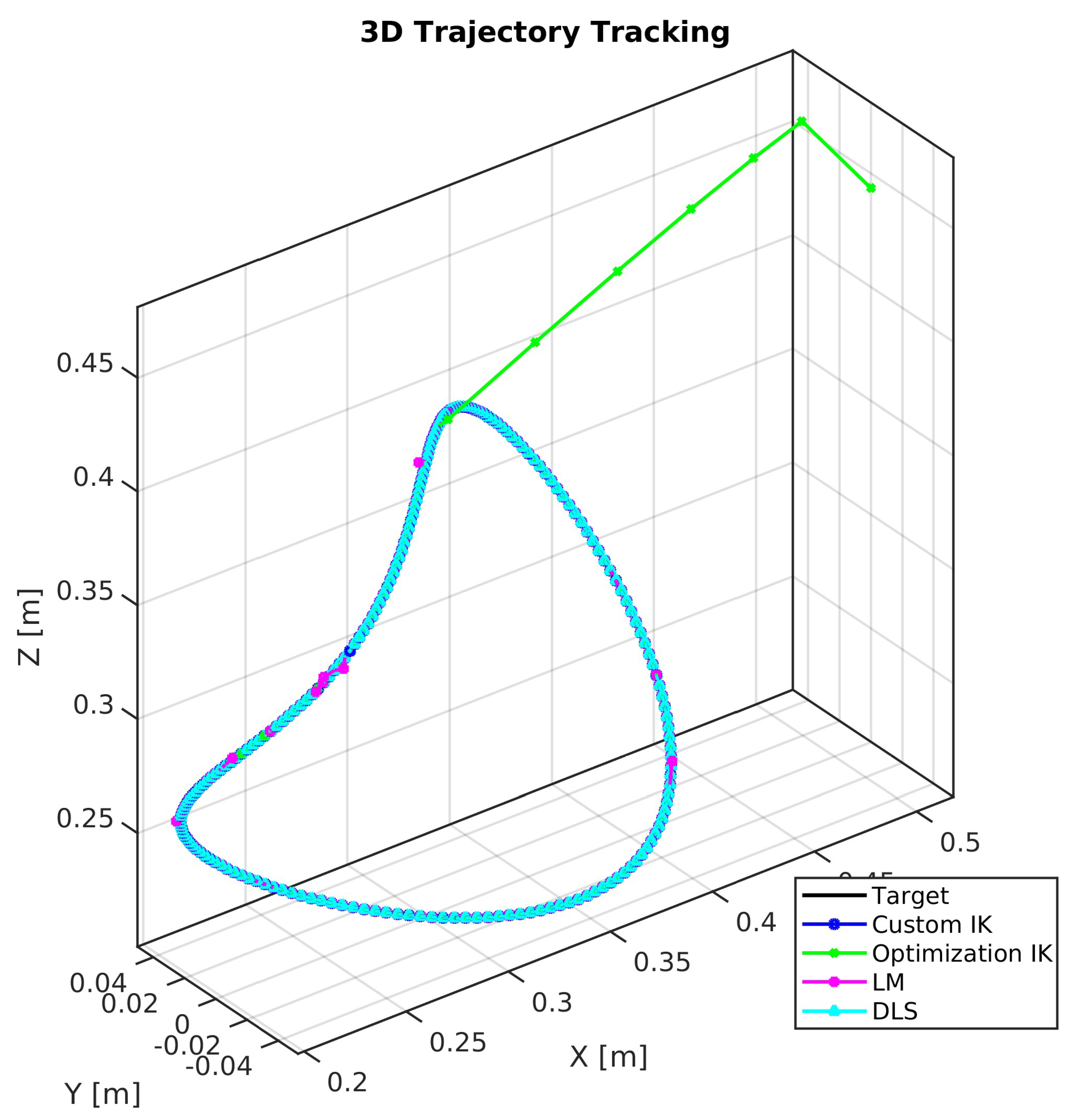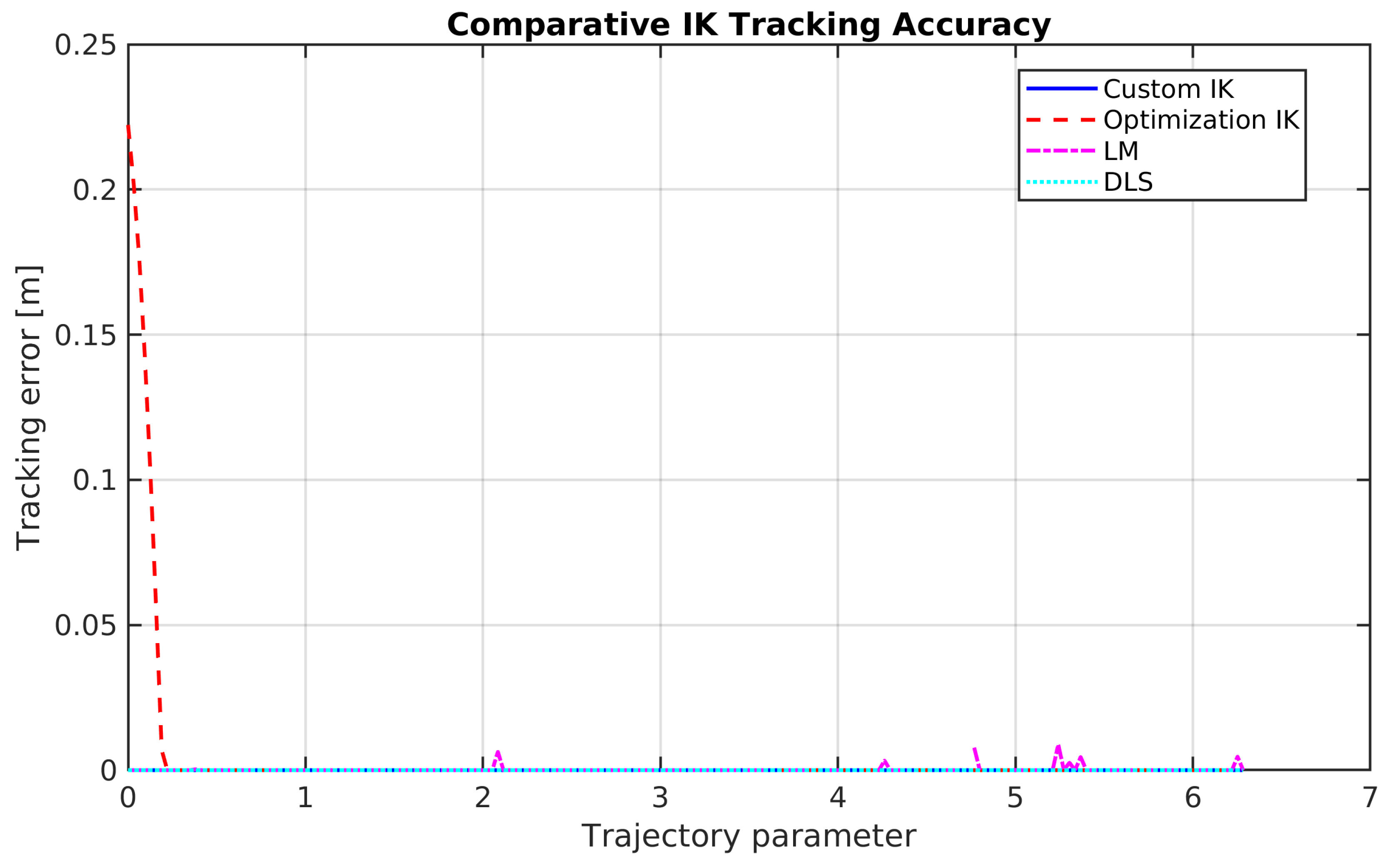 The proposed custom IK method demonstrated exceptional precision, achieving a mean and maximum tracking error of effectively zero (<10