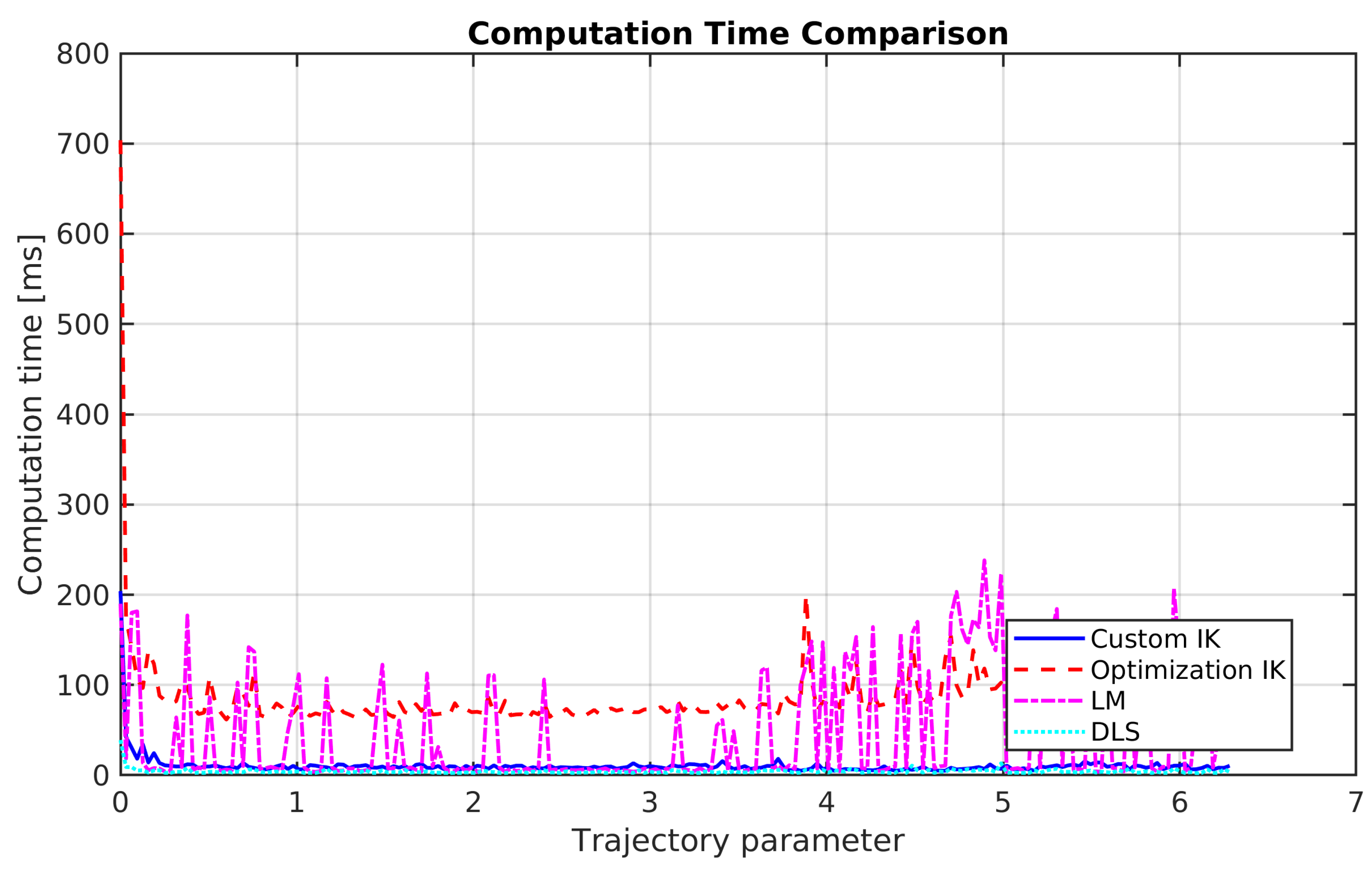 An examination of the joint-space paths reveals notable differences in smoothness and continuity. The custom IK produced smooth and continuous joint trajectories, characteristic of a solution that implicitly minimizes joint velocities. The optimization-based solver’s trajectories were less smooth and had occasional oscillations, suggesting solutions that, while locally optimal for the pose, may be suboptimal in terms of joint-space smoothness.