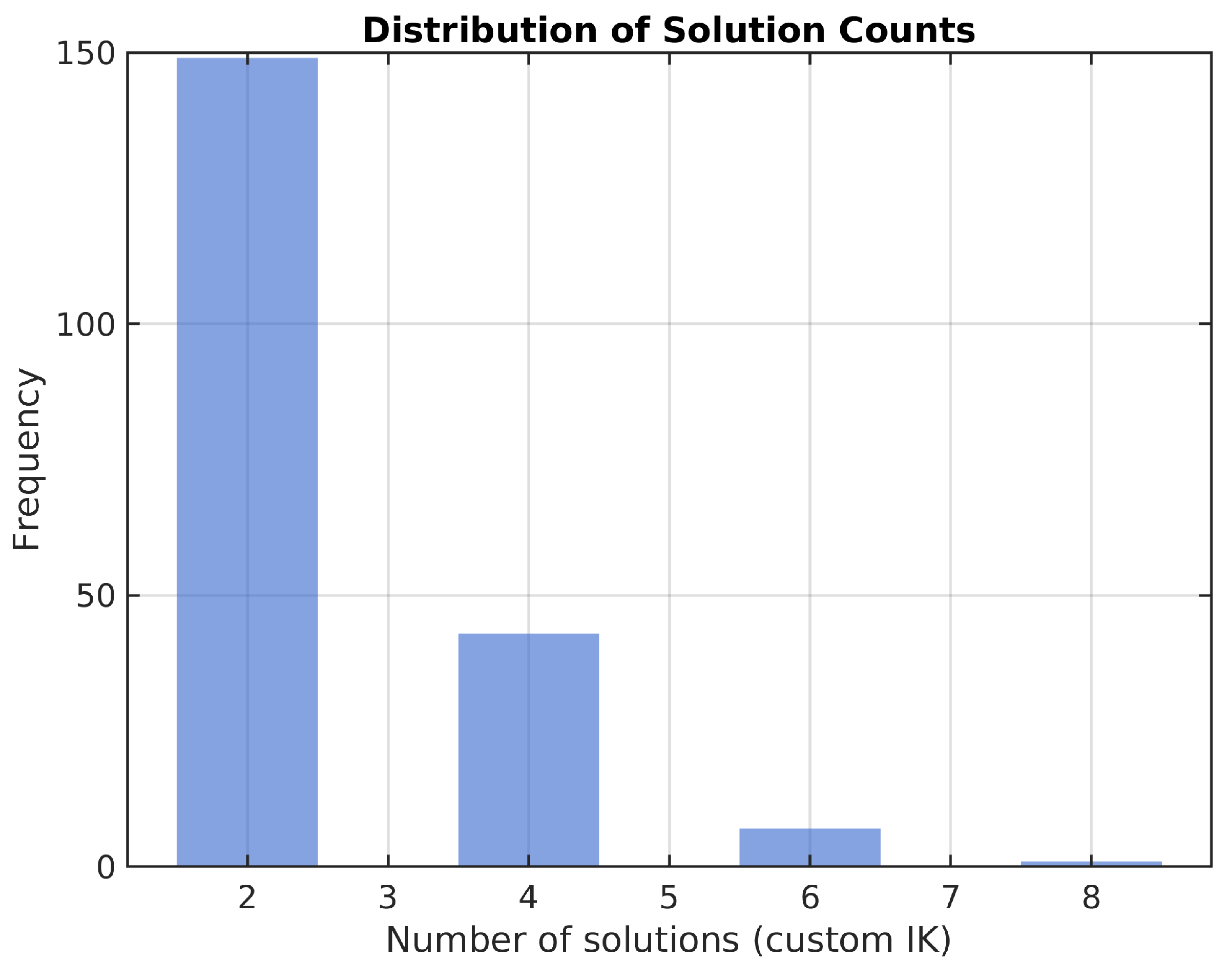 Figure 4, the proposed IK solver consistently identified a small number of distinct inverse kinematics solutions for each evaluated point. With a mean solution count of 2.6, this finding suggests a robust and well-defined analytical process, yielding a predictable and manageable set of kinematic configurations for a given end-effector pose.