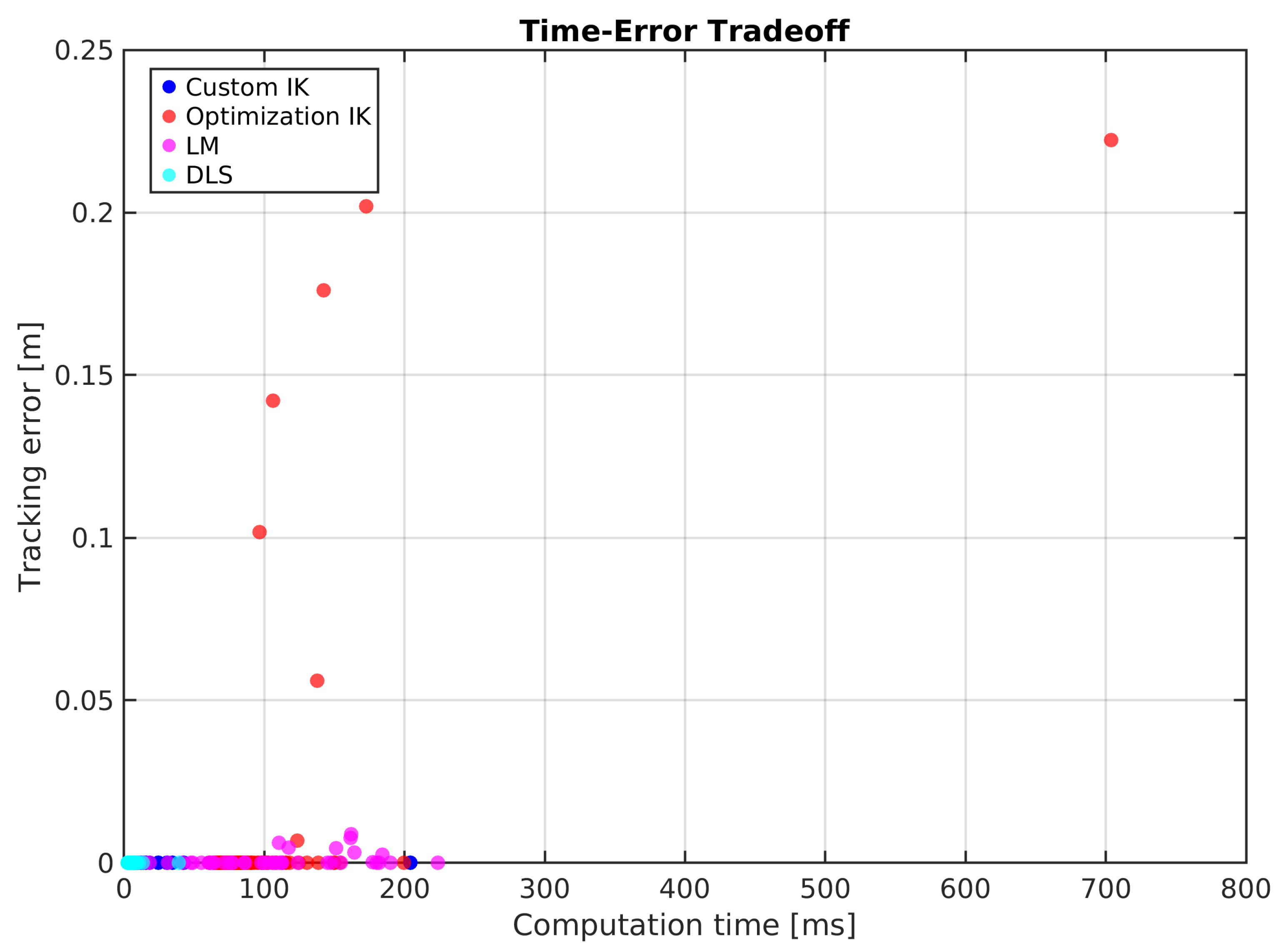 Figure 6 provides a clear summary of the performance comparison. The custom IK occupies the ideal region of the plot, consistently delivering high accuracy (low error) at very low computational cost. The optimization-based solver’s results are scattered, showing both higher computation times and wide variance in the tracking error. For LM, the points are concentrated near low error, but include several high-error and high-time outliers. DLS clusters at low time and modest error, but only yields one branch. Overall, the custom method remains the best choice for this application.