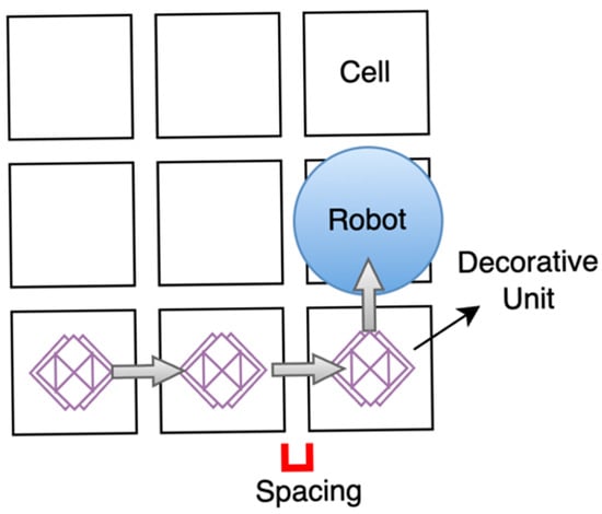The robot navigates a grid to create either consistent decorative units or diverse shapes, resulting in a complete floor-marking design. Each cell corresponds to the plotter’s full size, with cell spacing adjustable according to user-specified criteria for the required design.